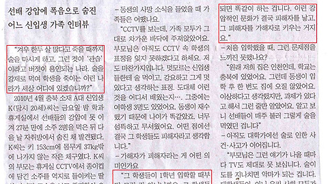 우리는 '학교폭력'과 관련된 교육 문제에 관한 소식을 적잖게 언론을 통해 듣고 있다. 지난번 '대구 중학생 자살 사건' 이후로 그동안 학교의 흑막에 감춰져 있던 여러 사건이 사람들에게 알려지게 되면서 많은 사람이 학교 폭력의 실체에 경악하였었다. 그 이후로 상당한 시간이 흘렀지만, 그 같은 학교폭력은 계속해서 빈번히 발생하고 있다. 교육부나 학교에서 학교폭력을 막기 위한 대책을 마련한다고 바삐 움직였으나 지금 성과를 거두고 있는 것은 거의 없다.