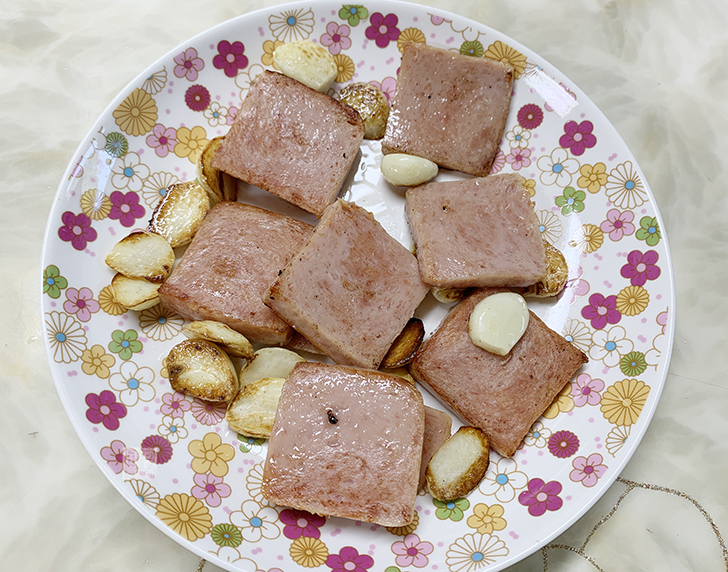 스팸과 마늘을 함께 구워주면 위 사진처럼 아주 먹음직스러운 스팸과 마늘의 모습을 볼 수 있다. 마늘이 가진 향과 맛이 스팸 자체의 맛과 어우러져 더욱 맛있게 먹을 수 있다. 살짝 기름진 것을 잡아주는 효과가 마늘에 있기도 하고, 앞서 말한 대로 스팸의 지나친 기름진(느끼한) 맛을 마늘이 적절히 케어를 해준다.