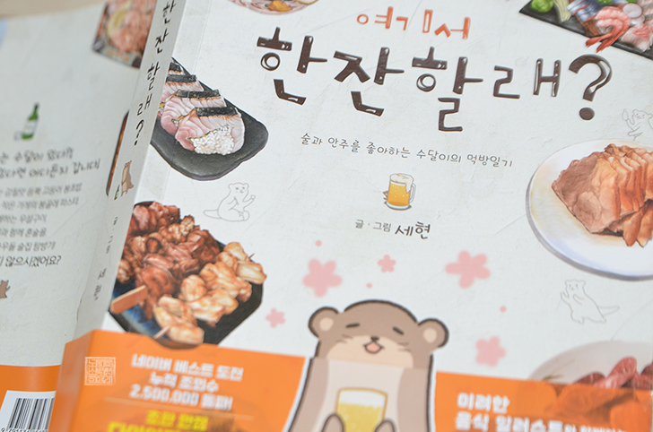 이번에 읽은 에세이 <여기서 한 잔 할래?>는 저자가 직접 쓴 글과 그린 그림을 활용해서 먹방 콘텐츠를 엮은 책이다. 책을 펼쳐서 읽어보면 저자를 상징하는 수달 그림과 함께 여러 맛집(?)을 탐방하며 한 잔 하는 저자의 모습을 무척 재미있게 그리고 있다.