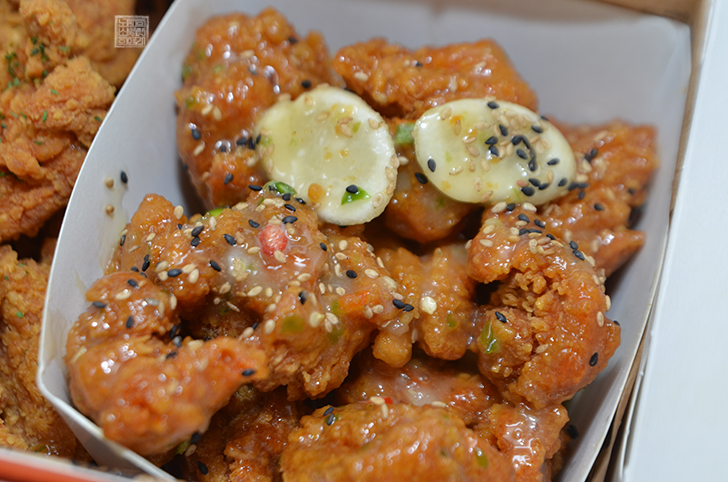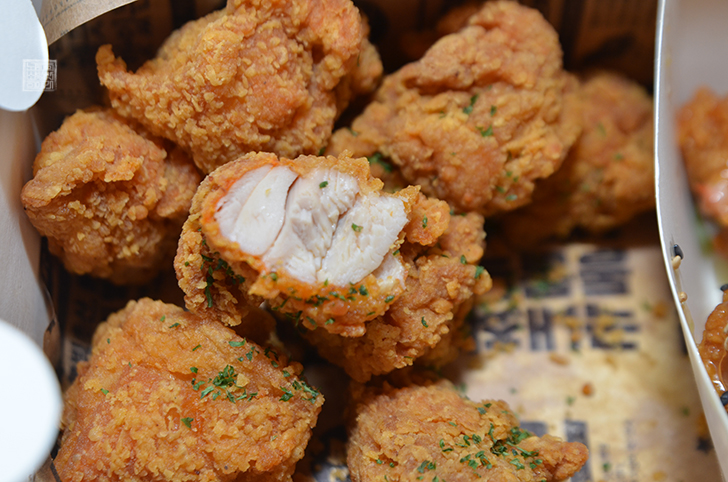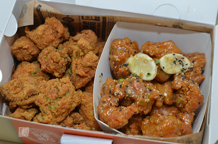 봉인 스티커의 문구가 '봉인 해제'라고 붙어 있어 괜스레 웃음이 나왔다. 봉인 해제 스티커를 살포시 떼어준 이후 치킨의 모습을 보면 위 사진과 같은 모습이다. 한쪽에는 맵슐랭 양념이 입혀진 순살 치킨이고, 한쪽은 맵슐랭 양념이 입혀지지 않은 핫 후라이드 순살 치킨이다. 매운맛에 도전하고 싶은 사람을 위한 조합이라고 할까?