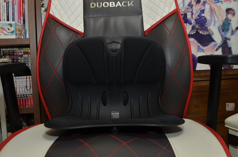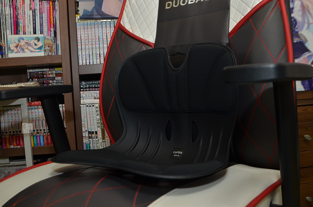 현재 사용하고 있는 듀오백 게이밍 의자에 올려두면 위와 같은 모습이다. 의자에 커블 체어 와이드를 올려둔 채로 커블 체어 와이드 위에 앉으니 딱 허리를 잡아주면서 자세가 바로 달라졌다. 의자에 앉아 있으면 나도 모르게 허리가 굽혀지면서 점점 의자 밑으로 엉덩이가 내려오고, 목과 허리가 함께 구부정해지기 마련이다.