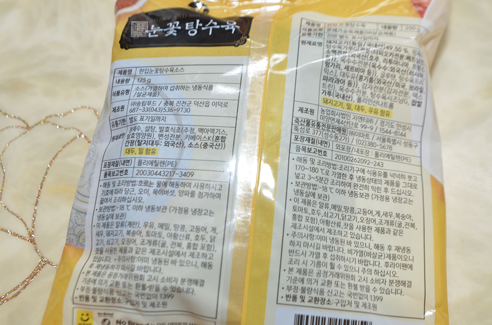 노브랜드에서 판매하는 냉동 탕수육의 이름은 한입 눈꽃 탕수육이다. 탕수육 자체으의 양은 250g, 탕수육 소스의 양은 125g으로 표기되어 있었다.