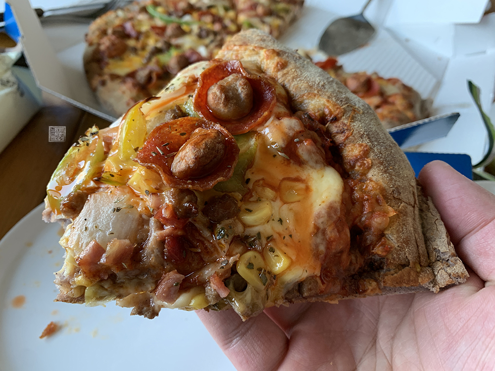 치즈 양이 조금 더 많았으면 하는 아쉬움이 있었지만 전체적으로 맛있게 먹을 수 있었다. 도미노 피자의 새로운 메뉴 뉴욕 오리진은 위 사진에서 볼 수 있는 것처럼, 페페로니와 베이컨을 메인 토핑으로 하여 다양한 토핑이 우후죽순 섞여 있다. 그래서 뭔가 딱 하나의 맛을 느끼기에는 아쉬움이 있다.