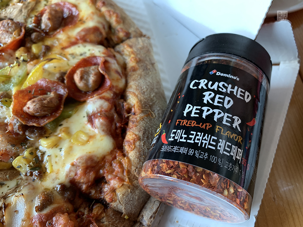 현재 도미노피자에서는 콜라를 주문하면 '크러쉬드 레드페퍼'를 함께 주는 이벤트를 진행하고 있다. 크러쉬드 레드페퍼는 이름 그대로 말린 듯한 고추가루가 들어가 있는 매운맛을 첨가할 수 있는 부차적인 재료다. 이게 피자 위에 뿌려서 먹으라고 있는 것 같아서 괜스레 피자 위에 톡톡 뿌려서 먹어보았다.