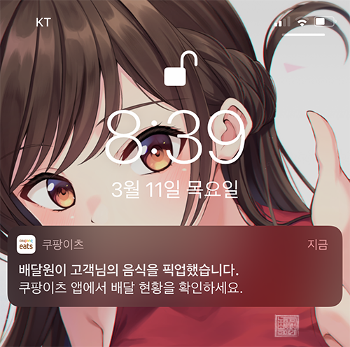 조정석 치킨으로 유명한 자담치킨에서 양념 한 마리를 주문했는데, 실시간 배송 상태 정보가 바로 쿠팡 이츠 알림으로 왔다.