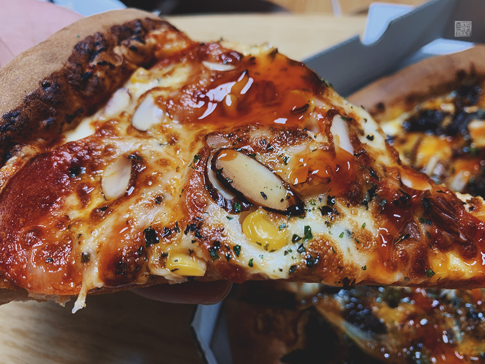 아이유의 모습이 예쁘게 인쇄된 피자 박스를 뒤로 하고, 피자의 모습을 보자면 다음과 같다.