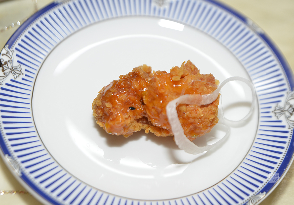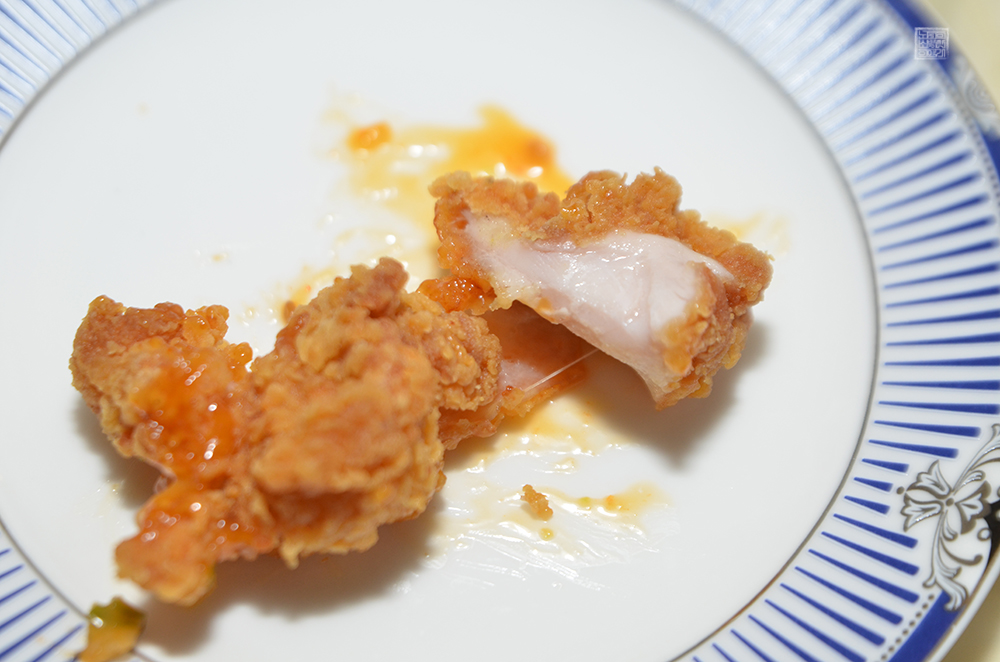 '어라? 매운 치킨이 아닌가?'라며 치킨 한 조각을 접시 위에서 살짝 젓가락으로 뜯어보았다.