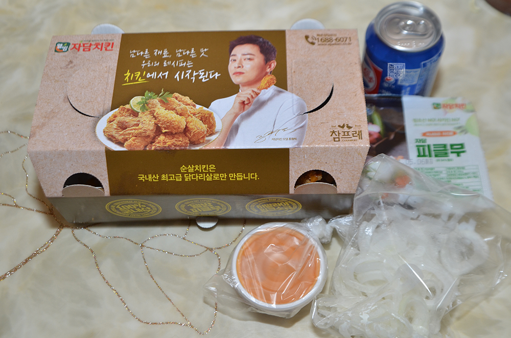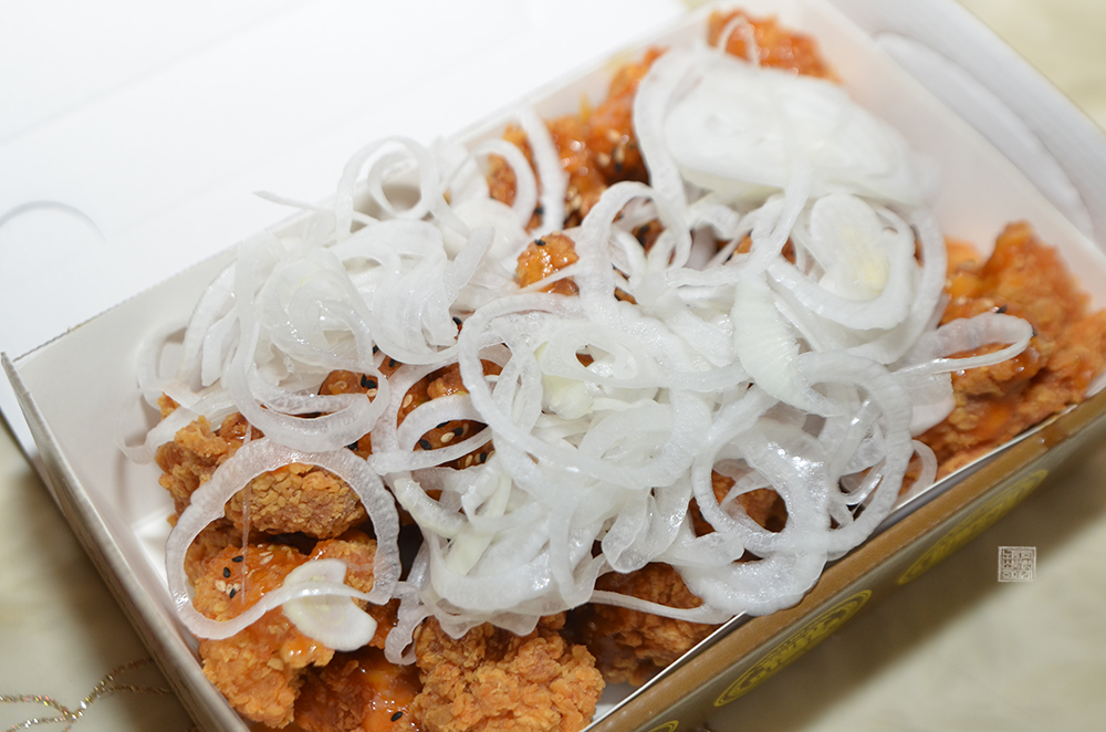 그래서 살짝 걱정이 되었지만, 일단 주문을 해서 도착을 했으니 TV 광고를 통해 볼 수 있었던 것처럼 치킨 위에 양파채를 살짝 올려서 사진을 먼저 찍기로 했다.