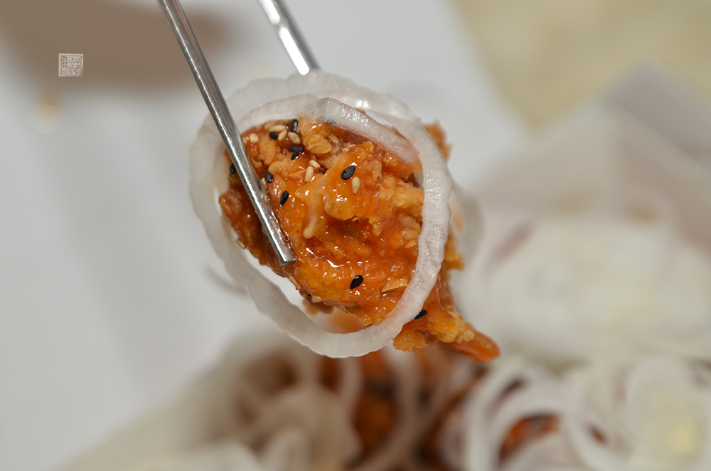 이렇게 보면 단순히 살짝 매운 소스가 곁들여져 있는 것보다 훨씬 더 치킨이 맛있어 보인다. 역시 양파채는 치킨과 고기 등을 먹을 때 빠질 수 없는 곁들임 채소다. 아무튼, 이렇게 사진을 찍은 이후에 얼마나 매운지 한번 시험 삼아서 한 조각을 먹어봤는데, 크게 치킨이 맵다고 느낄 수는 없었다.