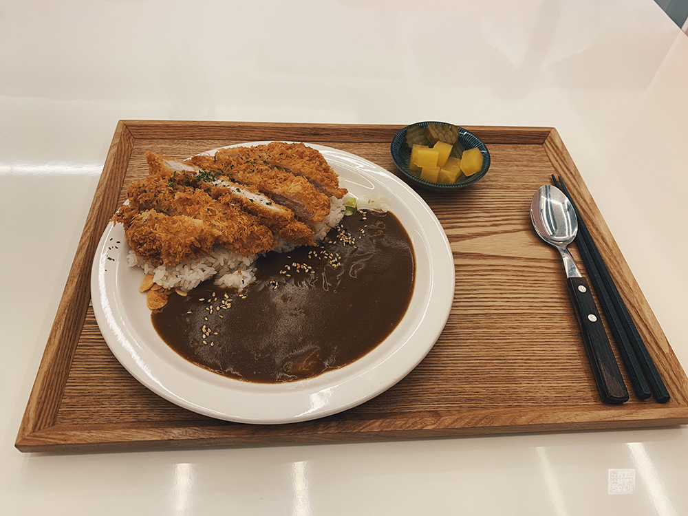 도착한 카레 돈가스의 모습은 다음과 같다. 앞서 말했듯이 장국이 셀프이기 때문에 처음 주문을 하고 나서 나온 메뉴를 받아왔을 때는 장국이 식판 위에 함께 있지 않았다. 장국을 퍼서 먹을까 싶기도 했지만, 여러모로 귀찮아서 장국은 그냥 먹지 않기로 하고 위 사진에서 볼 수 있는 카레와 수제 등심 돈가스를 중심으로 먹기로 했다.