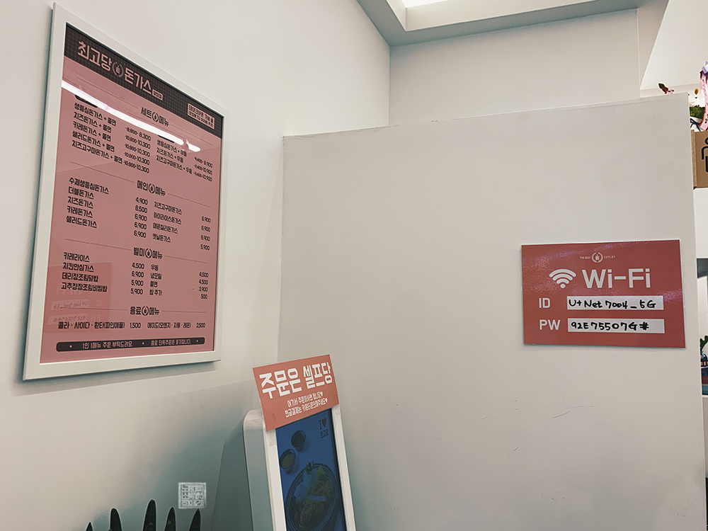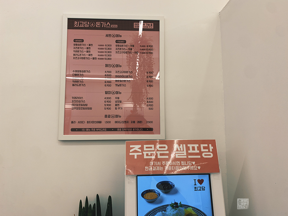 핑크 감성이 너무 돋아 들어가기는 살짝 망설여져도 내부에서 사진을 찍어서 인스타그램 같은 SNS에 자랑하기 좋은 가성비 돋는 돈가스 집 최고당 돈가스. 프랜차이즈이기 때문에 전국 곳곳에 드문드문 있다는 걸 지도 검색을 통해 알 수 있었는데, 만약 근처에 최고당 돈가스가 있다면 피크 타임을 피해 한번 방문해보기 바란다.