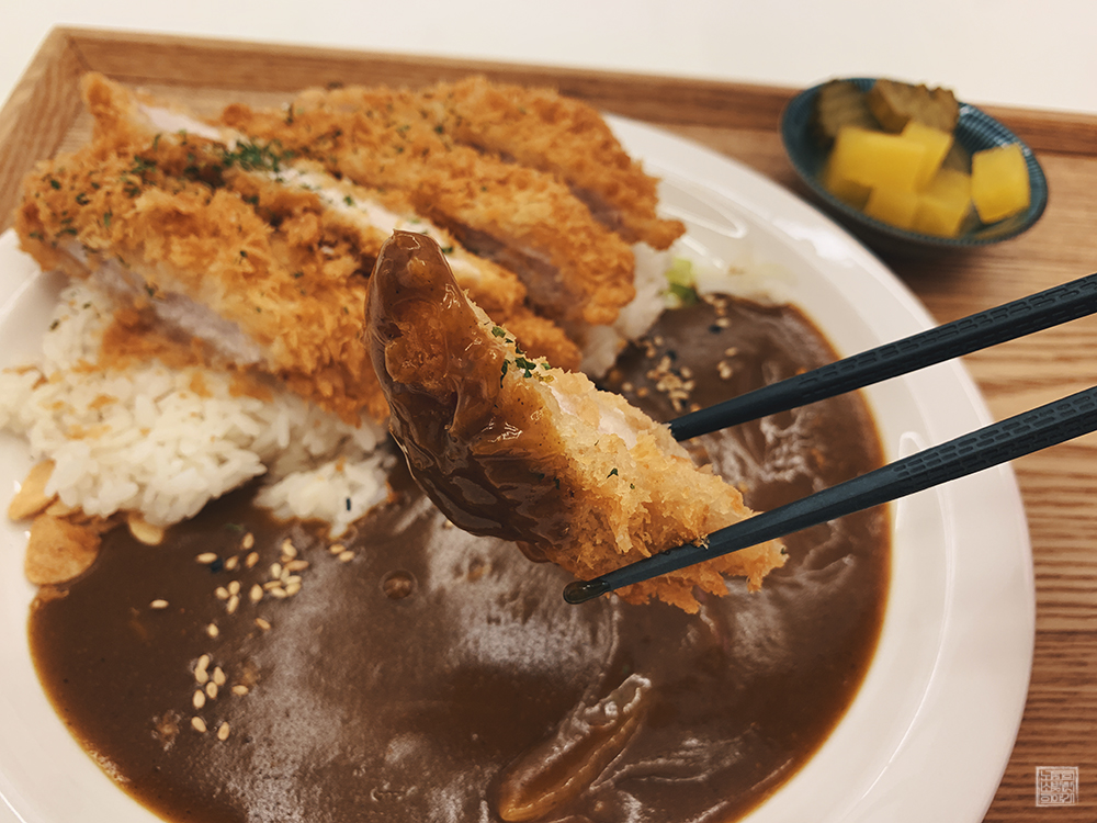 도착한 카레 돈가스의 모습은 다음과 같다. 앞서 말했듯이 장국이 셀프이기 때문에 처음 주문을 하고 나서 나온 메뉴를 받아왔을 때는 장국이 식판 위에 함께 있지 않았다. 장국을 퍼서 먹을까 싶기도 했지만, 여러모로 귀찮아서 장국은 그냥 먹지 않기로 하고 위 사진에서 볼 수 있는 카레와 수제 등심 돈가스를 중심으로 먹기로 했다.