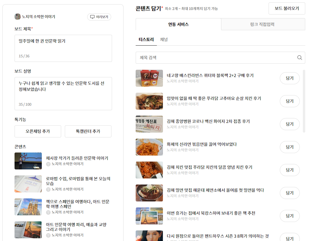 위 사진을 본다면 연동 서비스를 통해서 보드에 내 콘텐츠를 쉽게 담아서 발행할 수 있다는 걸 알 수 있다. 연동 서비스로 제공하는 기능은 현재 티스토리 블로그와 카카오 TV 채널, 브런치, 인스타그램 등의 채널로 차후 유튜브 채널 연동도 곧 지원할 예정이라고 한다. 즉, 보드에 발행할 수 있는 콘텐츠의 채널은 사실상 제약이 없는 거다.