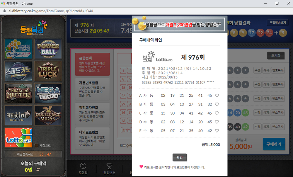 6. 구매할 복권 번호를 모두 기입했다면 이제는 구매하기 버튼을 누르면 끝이다.