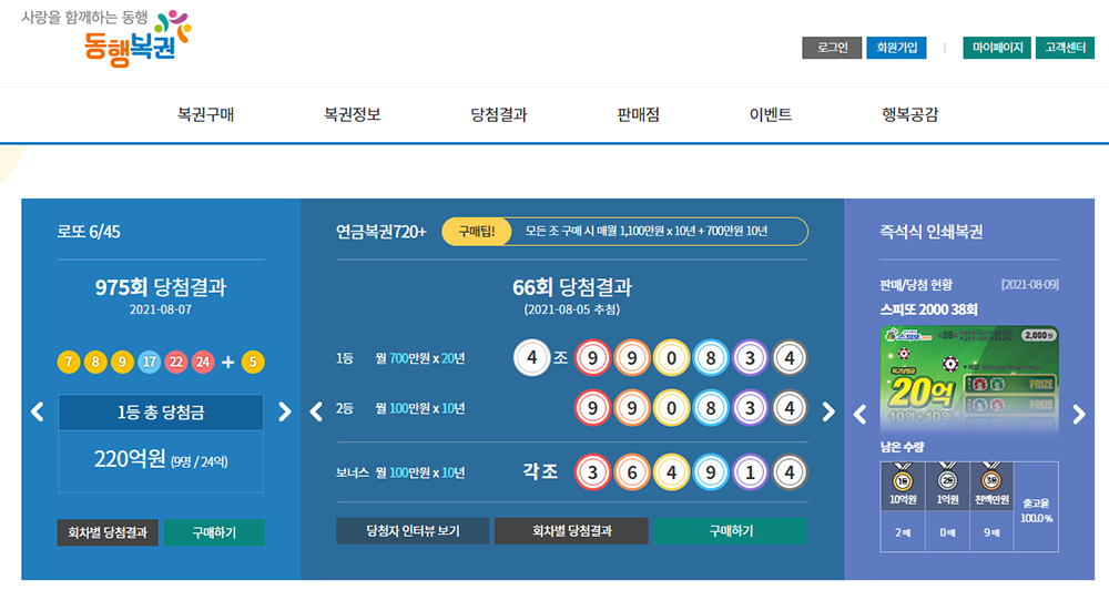 즉, 우리는 굳이 오프라인에서 사람들이 들락날락거리는 오프라인 복권 명당 판매점을 힘들게 직접 찾아가지 않더라도 충분히 당첨될 확률이 있을 복권을 온라인으로 구매할 수 있다. 해당 인터넷 복권 판매 사이트는 신용할 수 없는 곳이 아니라 동행복권을 판매하는 기관에서 직접 운영하는 홈페이지이기 때문에 믿고 살 수 있다.