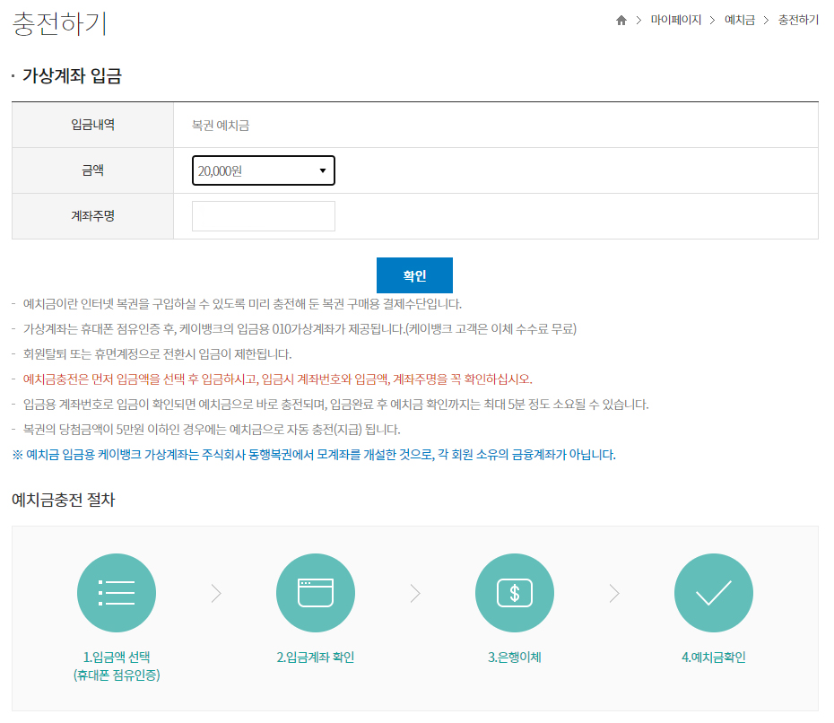 3. 아이디를 만들었으면 다음으로 할 일은 복권을 구매할 예치금을 입력하는 일이다. 예치금 충전 절차는 '입금액 선택→입금계좌 확인→은행이체→예치금 확인' 순서로 진행된다. 보통 2만 원 정도만 넣어 놓으면 한 달(3~4주) 동안 매주 5천 원 씩 로또 복권을 구매하는 데에 문제가 없다.