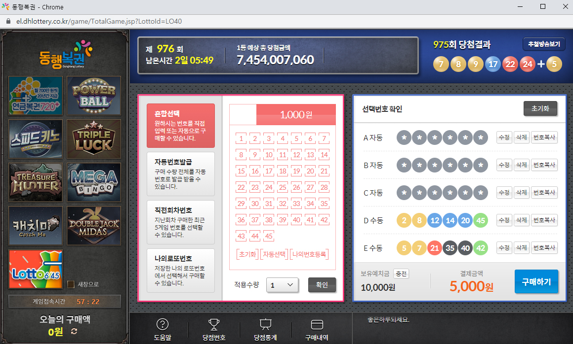 6. 구매할 복권 번호를 모두 기입했다면 이제는 구매하기 버튼을 누르면 끝이다.
