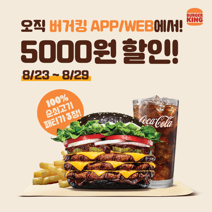 현재 버거킹에서는 온라인 공식 홈페이지와 어플을 통해서 주문한다면 5천 원 할인 이벤트를 진행하고 있다.