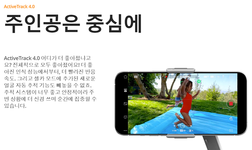 두 번째 기능은 바로 새롭게 적용된 Active Track 4.0 기능이다. 지난 오즈모 모바일4에서는 Active Track 3.0 기능이 첨부되어 있었지만 이번 5 시리즈를 통해서 5.0으로 업그레이드가 되었다. 3.0에서 우리는 일일이 따라갈 피사체를 직접 설정을 해야 했지만, 4.0에서는 그런 설정 필요 없이 자동으로 얼굴을 추적하면서 이용이 굉장히 편리해졌다.