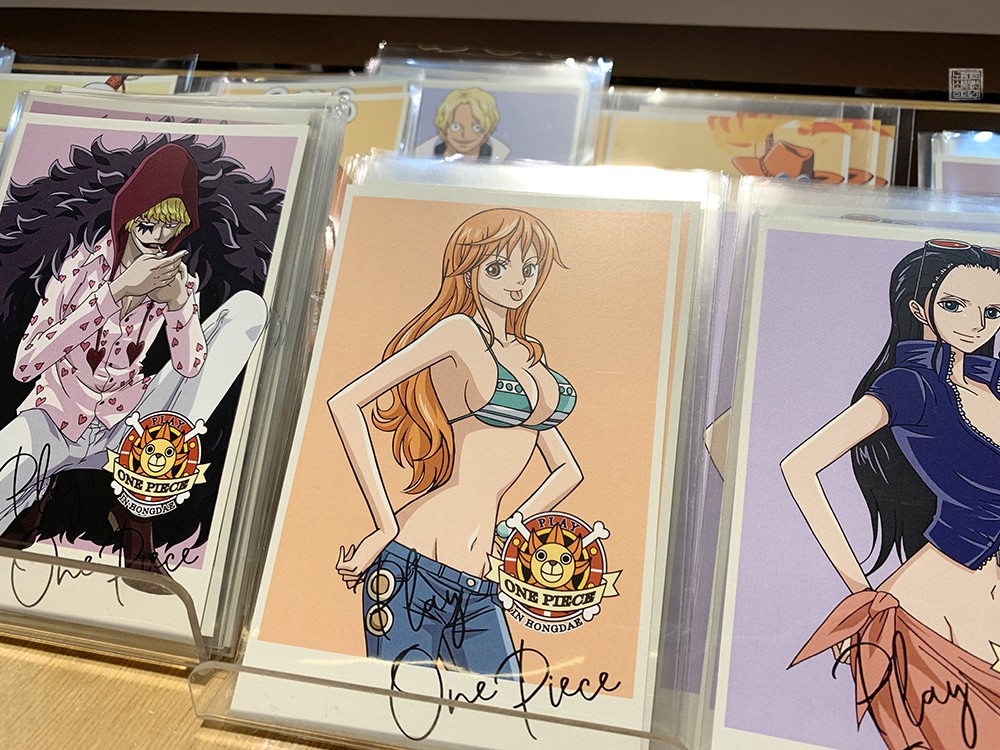 지금 이렇게 사진을 통해 다시 호버다로 Play ONE PIECE 매장에서 볼 수 있었던 일러스트 카드들이 정말 예쁘다는 걸 알 수 있다. 나는 당시 이곳에서 돈을 쓸 생각은 없었지만, 차후에 유튜브 채널에서 이벤트를 하거나 다른 출판사 이벤트에 참여할 때 사용할 생각으로 Play ONE PIECE에서 판매하는 일러스트 카드 몇 장을 구매하기로 했다.