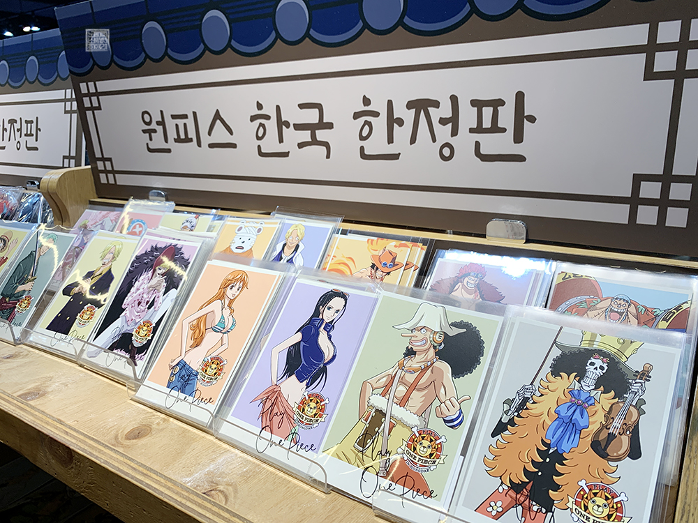 그리고 Play ONE PIECE 매장을 둘러보면 한국 한정판이라고 해서 우리에게 익숙한 복장을 입고 있는 <원피스> 캐릭터 패널을 만날 수 있다. 이 패널이 놓여 있는 곳을 본다면 엽서 카드 형태로 판매되는 일러스트 카드를 확인할 수 있는데, 이게 또 원피스 한국 한정판으로 그려진 일러스트이기 때문에 여러모로 마음에 들었다.