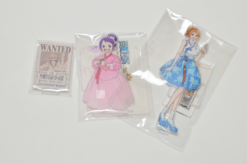 내가 구매한 굿즈는 캐릭터 아크릴 스탠드 두 개, 나미 일러스트 카드 두 장을 포함해 총 네 개의 굿즈를 구매했다. 사진에서 볼 수 있는 에이스 현상 수배 전단지와 악마의 열매가 그려진 아크릴 스탠드는 Play ONE PIECE에서 1만 원 이상 구매할 경우 돌릴 수 있는 룰렛 이벤트를 통해 받아볼 수 있었던 사은품이었다.