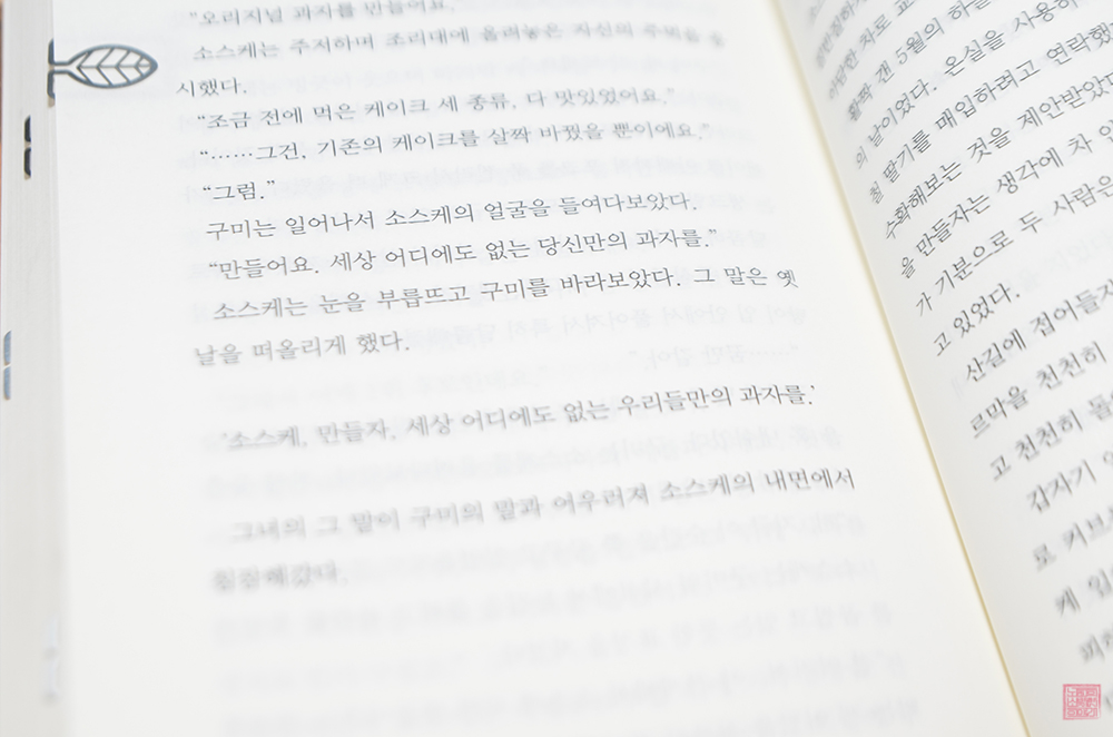 그렇기 때문에 <만국과자점 마음 가는 대로>는 제법 많은 소제목을 가진 단편으로 구성이 되어 있어 평소 긴 이야기를 읽지 못하는 사람도 부담 없이 읽어볼 수 있는 소설이다. 그리고 소설에서 읽어볼 수 있는 과자를 만드는 소스케의 모습에 대한 묘사도 제법 훌륭하게 잘 묘사되어 있어 읽는 재미가 있었다.