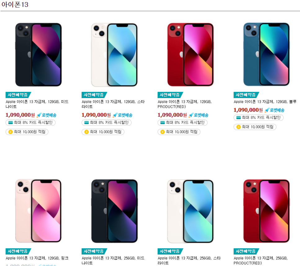 현재 쿠팡에서 진행 중인 자급제 사전 예약에서 아이폰13 시리즈의 모습을 살펴본다면 역시 핑크 모델이 압도적으로 팔리면서 일시 품절이 되어 있었다. 다른 색상은 모두 넉넉하게 구매할 수 있기 때문에 서둘러서 구매해야 한다는 압박감은 없지만, 위 사진처럼 여러 모델의 색상을 비교해놓고 보니 역시 핑크가 제일이다.