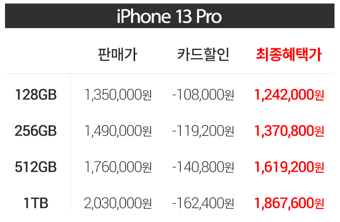 현재 쿠팡에서 제공하는 아이폰13pro 자급제 사전 예약 카드 할인 최종 혜택가는 다음과 같다.