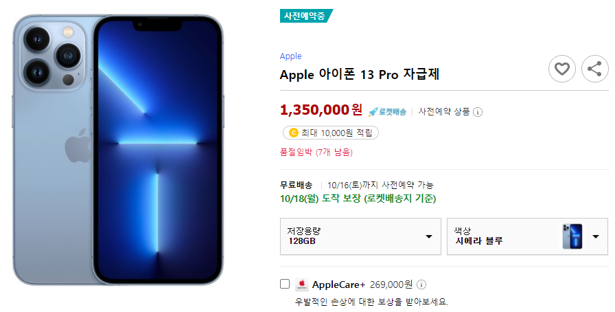▲ 인기 색상과 모델은 빠르게 품절 중인 아이폰13pro 자급제