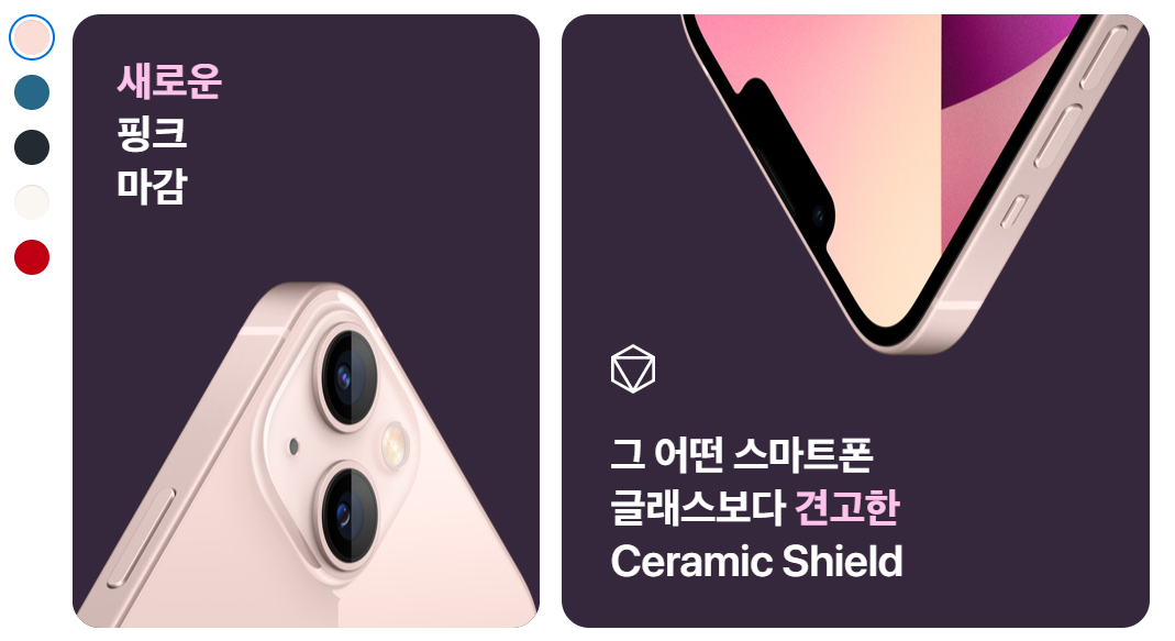 만약 내가 아이폰13pro 모델이 아니라 아이폰13 모델을 구매할 예정이었다면 핑크를 구매했을 것이다. 아이폰13 시리즈는 아이폰13 mini, 아이폰13, 아이폰13 pro, 아이폰 13 max 네 가지 종류(욕심도 많다;)로 출시가 되었기 때문에 색깔부터 시작해서 각 기능, 그리고 용량 선택을 자신의 기호에 맞춰서 마음껏 구매할 수 있다.
