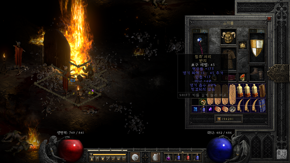 나 같은 경우에는 극블리 소서리스로 스킬 트리를 구성한 데다가 옛날의 추억 그대로 불벽을 후속 스킬로 올린 덕분에 화염 저항 혹은 냉기 저항을 갖춘 몬스터들은 상대할 수가 없었다. 다행히 메피스토는 이 두 개의 저항을 모두 갖추고 있지 않기 때문에 일단 중앙까지 텔레포트로 날아가서 정면 대결을 하면 된다.