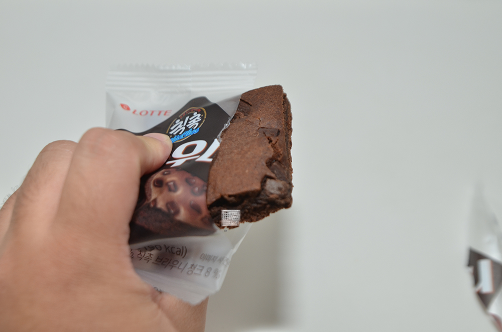 제품을 본다면 밀크 초콜릿 30%, 칙촉 브라우니 청크 8%이 들어가 있다고 포장 용기에 적혀 있는데, 실제로 한입 베어 먹었었을 때 아주 맛있는 달달함을 만끽할 수 있었다. 역시 우리가 원하는 달달한 과자는 바로 이런 브라우니 같은 디저트이지 않을까 싶다. 스트레스를 받을 때, 피곤할 때, 짜증이 날 때는 역시 달달한 게 최고였다.