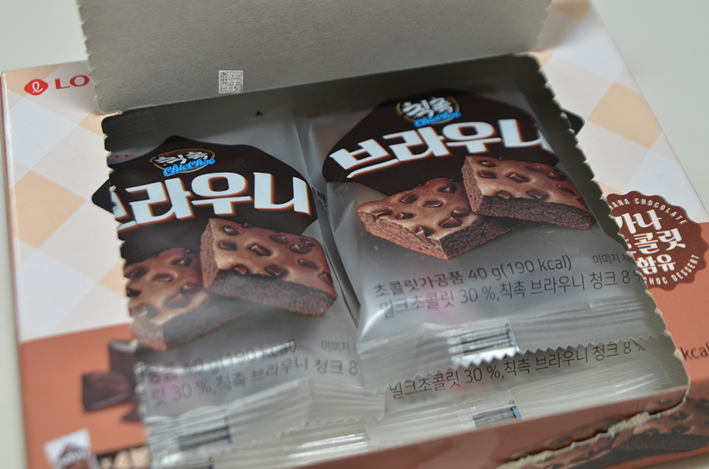 칙촉 브라우니는 제법 수량이 많이 들어가 있는 칙촉 초코 쿠키와 달리 딱 네 개가 들어가 있지만, 가격은 칙촉에 맞먹는 수준이었던 것 같다. 다소 가격은 비싼 편에 해당하는 과자이기는 해도 '브라우니' 형태로 가공된 조금 더 고급진 디저트 같은 형태의 과자라는 걸 생각하면 가격은 충분히 이해할 수 있다.