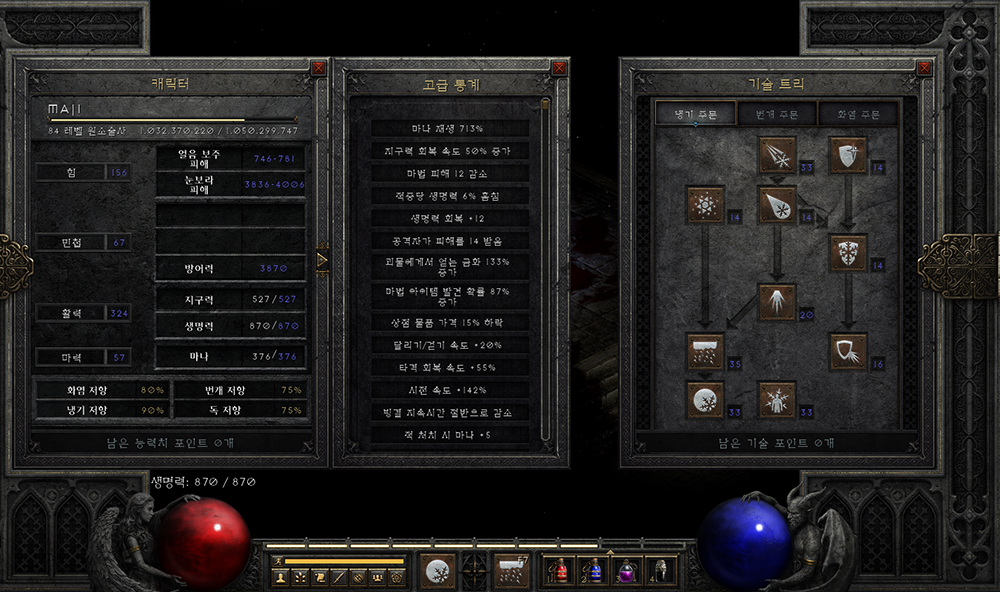 하지만 그건 도무지 내 취향에 맞지 않아서 나는 스킬트리를 초기화한 이후 오브(얼음보주)를 메인 활용 스킬로 한 극오브 블리 소서리스의 형태로 스킬틀 다시 맞췄다. 그랬더니 이전과 비교할 수 없을 정도로 사냥이 쾌적해졌을 뿐만 아니라(물론, 냉기 면역 몬스터가 없다는 전제 하에서) 1원소로 스킬을 세팅한 덕분에 대미지도 굉장히 높아졌다.