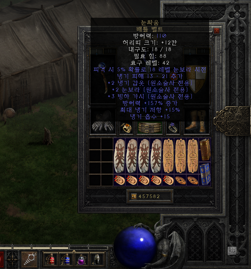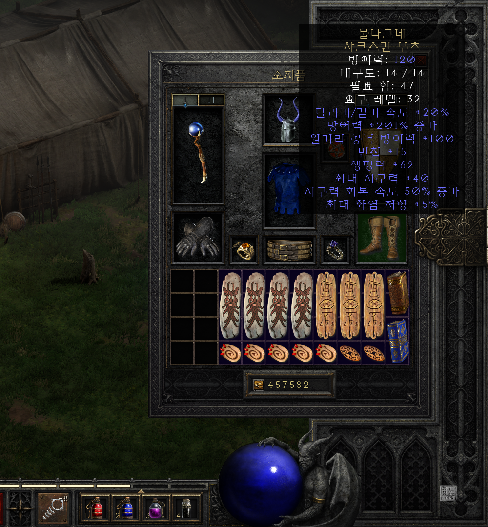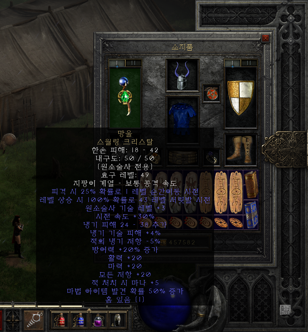 아, 하나 부족한 게 있다면… 매직 아이템 발견 확률(매찬)이 100%도 되지 않는다는 점이다. 아마 이 부분은 차후 시전 속도 20%를 포기하면서 행운 장갑을 가지고 오거나 배틀부츠를 하나 더 구한다면, 배틀부츠를 해당 극오브 블리자드 소서리스에 끼워서 활용을 해야 할 것 같다. 어차피 게임에서 아이템은 나올 놈만 나오기 마련이니까.