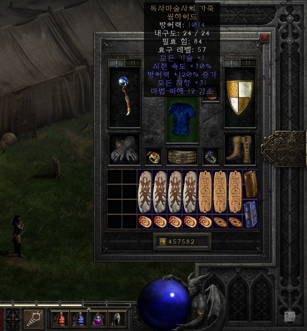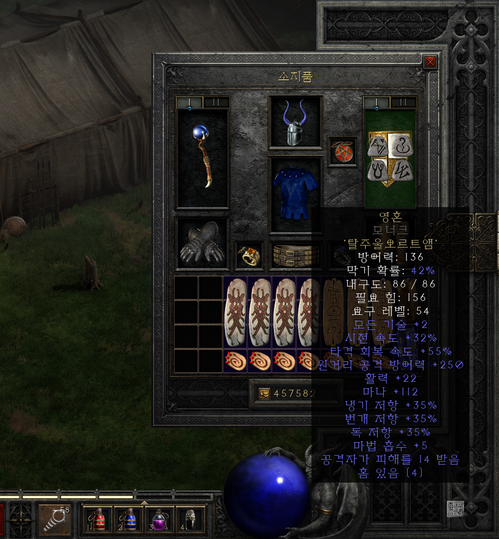 나머지 아이템은 그냥 사진을 통해서 하나씩 확인을 해보도록 하자. 평범하게 구해서 입을 수 있는 구교복을 업그레이드한 갑옷을 비롯해 모너크 영혼 룬워드, 마수 장갑, 눈보라 벨트와 시전 향상이 붙은 반지를 착용해서 현재 시전 속도 143%를 맞추고 있다. 원활하게 텔레포트를 쓰기 위해서는 최소 시전 향상은 140%는 되어야 한다고 생각했다.