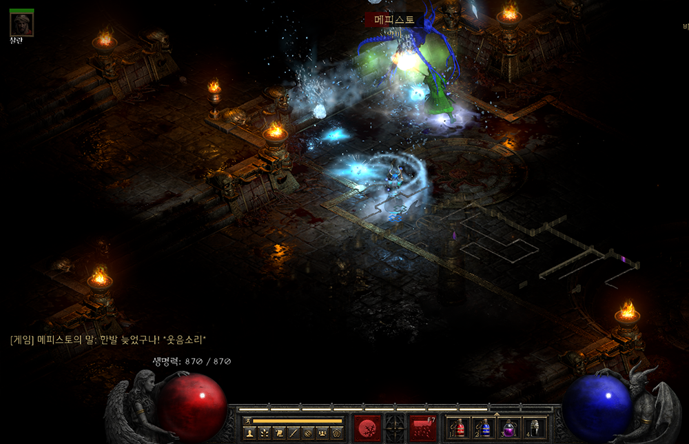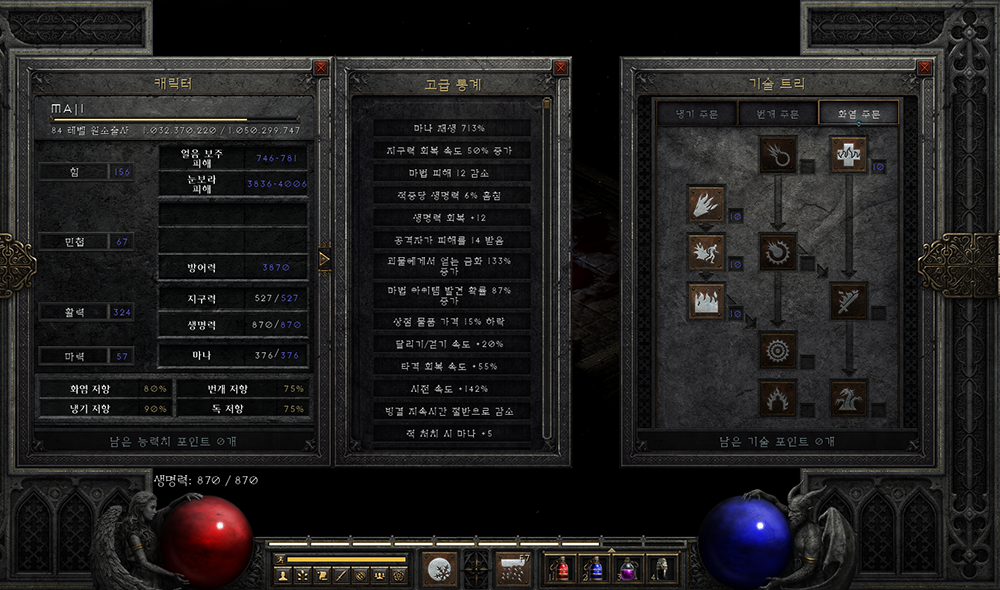 그 이외의 주문은 번개 주문에서 염력과 텔레포트를 한 개씩만 찍어주었고, 화염 주문에서는 온기 한 개와 함께 스킬 포인트 3개를 활용해서 불벽까지 딱 1개를 찍어주었다. 다른 아이템 스킬 덕분에 스킬의 레벨이 최대 10까지 오르기는 했지만, 막상 안다리엘과 메피토스를 잡을 때는 현 상태로 불벽까지 사용하지 않아도 충분히 해결이 가능했다.