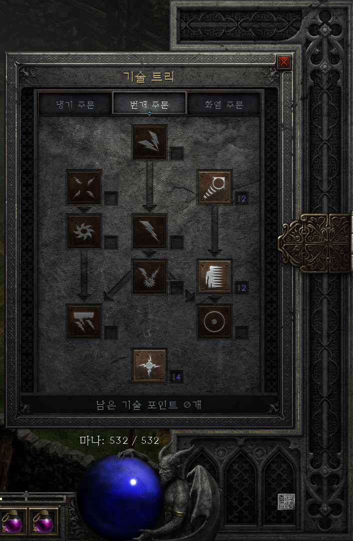 번개 주문의 스킬트리에서는 번개 스킬 마스터리 1개와 염력, 텔레포트에 1개씩 스킬 포인트를 투자했고, 화염 주문의 스킬트리에서는 불벽을 찍기 위해서 앞 스킬을 1개씩 찍어준 이후 불벽 스킬을 마스터했다. 이외에는 화염 마스터리와 온기에 1개씩 스킬 포인트를 투자해서 무난하게 불벽을 사용할 수 있도록 해주었다.