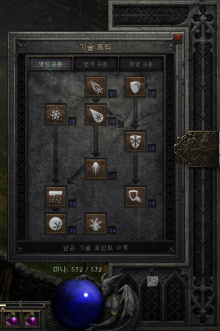 냉기 주문의 스킬트리를 본다면 블리자드(눈보라)와 오브(얼음보주), 콜드 마스터리 스킬 세 개를 모두 마스터해주었다. 그리고 나머지는 모두 스킬을 하나씩만 찍은 이후 다른 챕터에서 필요한 스킬을 마스터하거나 한 개씩 찍은 이후 남는 스킬은 모두 오브와 블리자드 대미지를 올리기 위해서 얼음살에 투자를 해주었다.