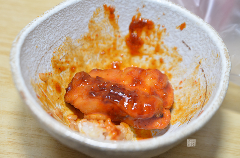 그렇다. 썩 맵지 않았을 뿐이지 안 매운 건 아니었다. <꾸브라꼬 숯불 두 마리 치킨>의 양념 치킨은 보통맛으로 해도 살짝 맵게 느껴지는 양념이니 혹시 이 글을 보고 '오늘 저녁은 <꾸브라꼬 숯불 두 마리 치킨>이다!'라고 생각하는 사람이 있다면 참고하도록 하자. 뭐, 양념은 살짝 매콤해야 먹는 맛이 있지 않을까 싶다. (웃음)