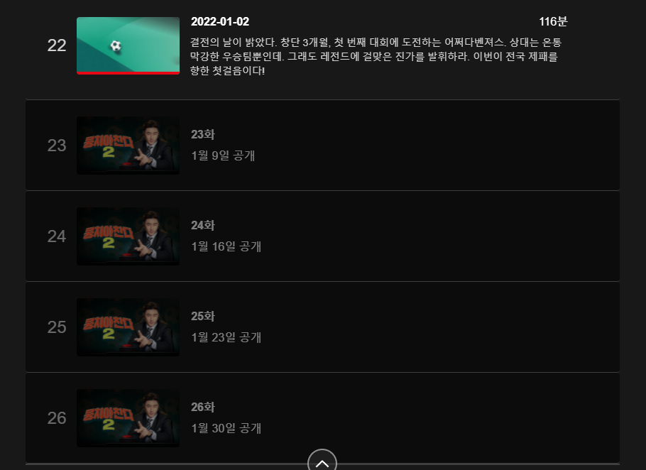 아쉽게도 넷플릭스에서는 <뭉쳐야 찬다1>은 볼 수 없지만 <뭉쳐야 찬다2>는 화제가 되었던 오디션 편부터 시작해서 지금까지 공개되어 있는 모든 화를 볼 수 있다. 그리고 현재 차후 공개 예정으로 잡혀 있는 23화부터 26화는 JTBC 채널을 통해 공개된 이후 차례대로 넷플릭스에 공개될 예정이다.