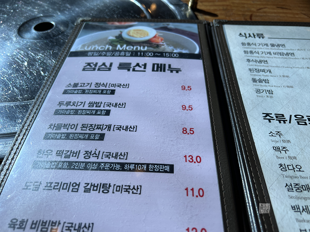 도담의 점심 특선 메뉴에는 두루치기 쌈밥(9,500원) 외에도 소불고기 정식, 차돌박이 된장찌개, 한우 떡갈비 정식 등 다양한 메뉴가 있다. 개인적으로 하루 10개 한정 판매라고 적혀 있는 한우 떡갈비 정식도 먹어보고 싶기는 하지만, 가격이 조금 세다 보니 어머니와 내가 둘이서 점심을 먹으러 가게 되면 늘 두루치기 쌈밥 정식을 먹는다.