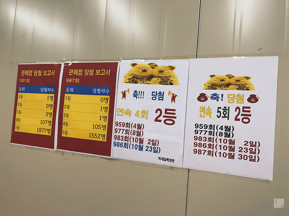 해당 복권 판매점의 당첨 이력을 본다면 1001회까지 1등 당첨만 총 세 번이 되었을 뿐만 아니라 지난 1001회 추첨에서도 1등 한 명과 함께 3등 세 명이 나올 정도로 명당 중 명당이었다. 그리고 복권 판매점 내부에 붙어 있는 복권 당첨 현황을 본다면 지난해에 연속 5회 2등이 나올 정도로 정말 부산 서면에서 손에 꼽히는 복권 명당이었다.