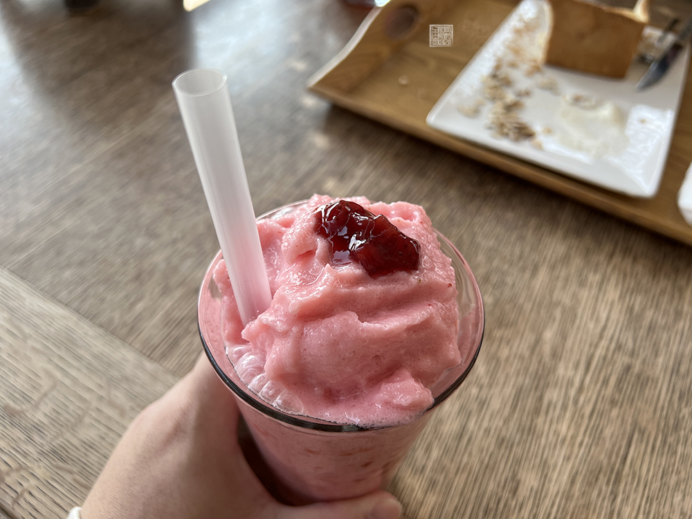식사류를 판매한다고 해도 역시 카페다 보니까 식사류보다는 카페에 걸맞은 메뉴를 주문해서 먹는 게 최선이지 않을까 싶다. 나는 당시에 수제 돈까스를 다 먹은 이후에 마실 게 물밖에 없다 보니 어머니와 이모가 자몽차를 마시는 동안 그냥 있기도 그래서 딸기 요거트 스무디를 한 개 주문해서 마시기로 했다.