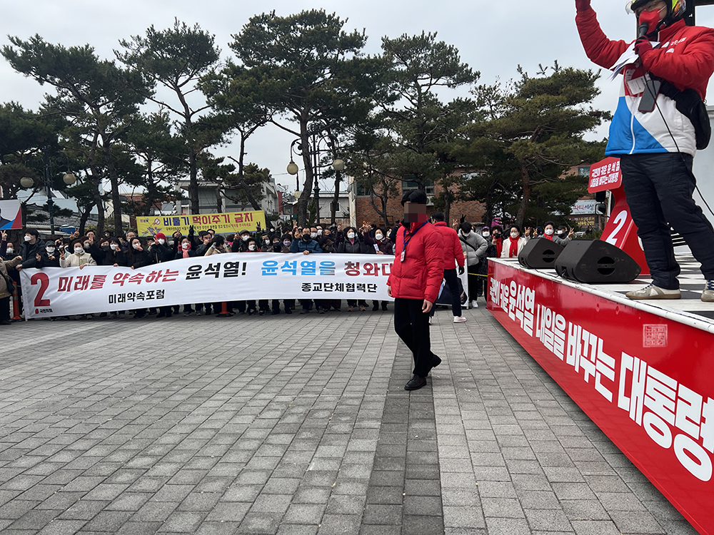후보의 도착이 늦어지면서 유세 현장에서는 김해 전 국회의원 출신이자 현재는 거창의 국회의원인 김태호와 차기 김해에서 국회의원 선거에 출마하고자 하는 홍태홍 등이 참여해 윤석열 후보의 지지를 호소했다. 그리고 시간이 흘러 12시 30분 정도가 되었을 때 드디어 윤석열 후보가 김해 수로왕릉에 도착해 무대에 올랐다.