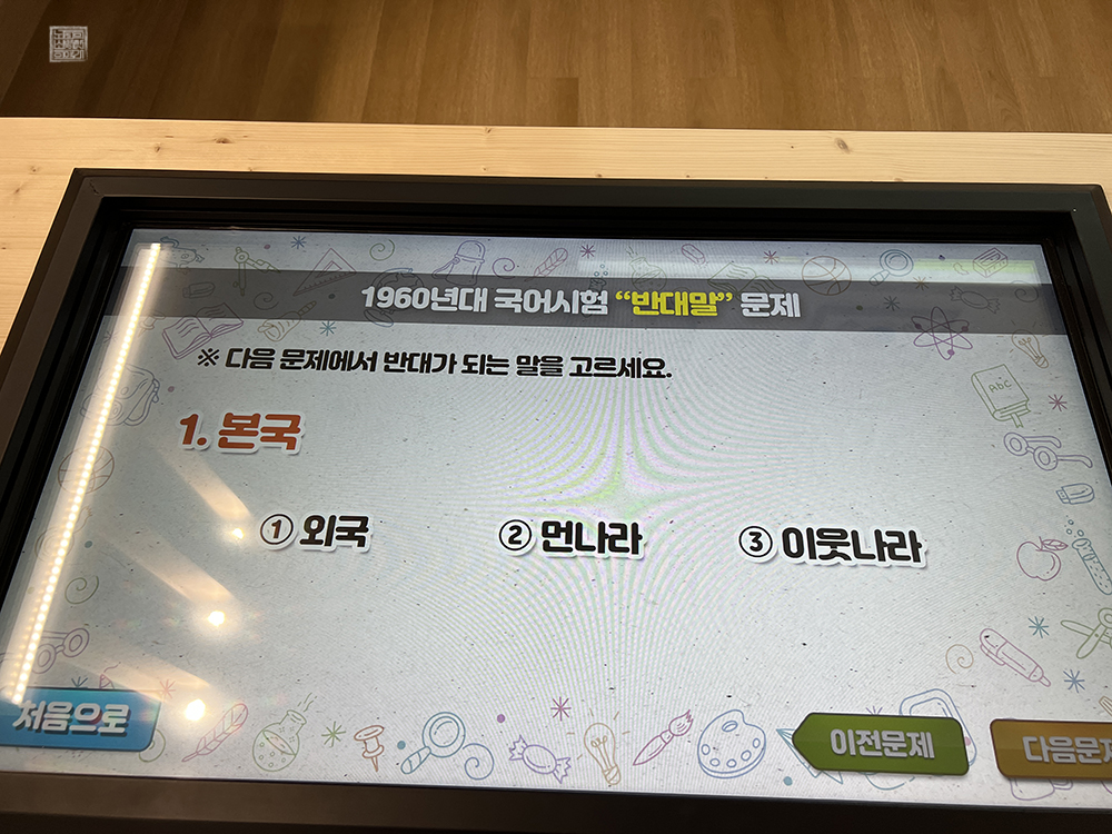 제2전시실의 끝자락에서 다시금 중앙 통로로 향하는 길을 가다 보면 아래 사진에서 볼 수 있는 옛 교실(오늘날 교실의 풍경도 크게 다르지는 않지만)을 재현한 동시에 옛날 교과서를 배치해둔 전시 공간을 볼 수 있다. 이곳에서는 터치 스크린 화면을 통해서 우리말 퀴즈도 풀 수 있어 제법 호기심 가득한 눈으로 둘러볼 수 있었다.
