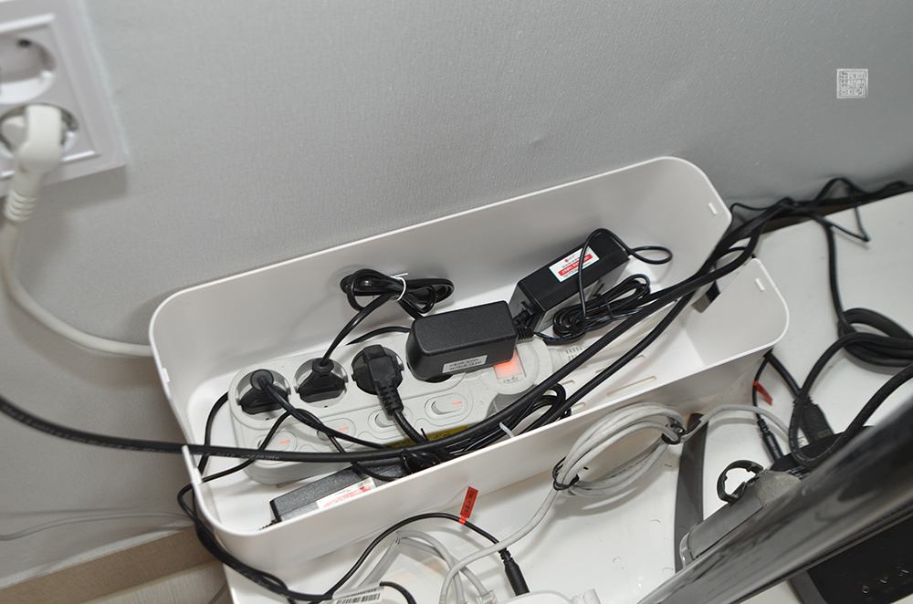 그래서 나는 한동안 멀티탭 정리함 앞에 앉아서 선들이 최대한 맞물리지 않도록 깔끔하게 정리하는 데에 시간을 쏟을 수밖에 없었는데… 어느 정도 정리를 끝내고 다서 뚜겅을 덮은 모습은 다음과 같다.