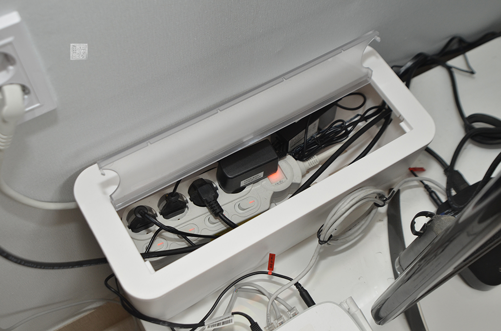 그래서 나는 한동안 멀티탭 정리함 앞에 앉아서 선들이 최대한 맞물리지 않도록 깔끔하게 정리하는 데에 시간을 쏟을 수밖에 없었는데… 어느 정도 정리를 끝내고 다서 뚜겅을 덮은 모습은 다음과 같다.
