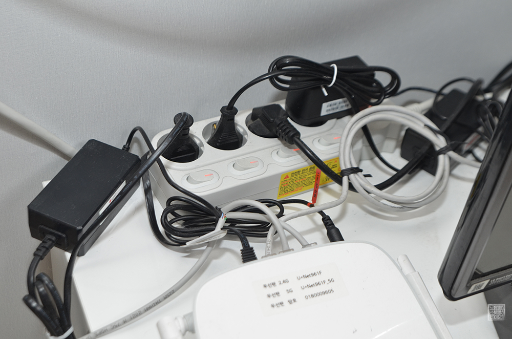 그런데 멀티탭을 멀티탭 정리함에 그냥 넣으려고 하니 뭔가 깔끔하지가 않았다. 사이즈가 조금 넉넉하게 일부러 대형 모델로 주문했어도 멀티탭에 꽂아 놓은 인터넷 공유기와 셋톡박스로 연결되는 케이블에 달린 어댑터의 크기가 조금 있다 보니 공간이 그렇게 넉넉하지 않았다. 이것보다 작은 걸 주문했으면 사용하는 것 자체가 어려워 보였다.